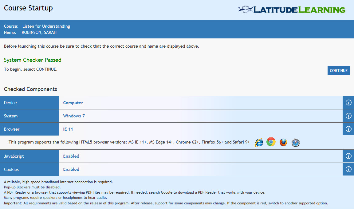 - System Checker – When enabled, this new tool allows LMS Administrators to define system requirements for their eLearning content: devices, operating systems, browsers, cookies, Javascript. On course launch, the LMS will check the accessing device and inform students whether or not their machine meets defined requirements. Either way, students are able to click “Continue” and launch SCORM content. Brand the System Checker tool from your Site Management > LMS Information page, where you go to configure system requirements.