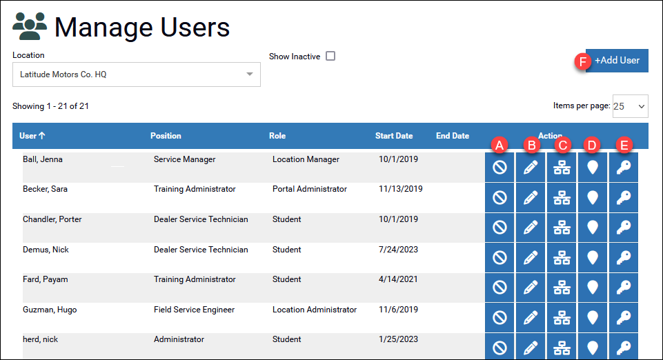 This new page, if displayed on Navigation, allows users with the Location Administrator or Administrator roles to manage users to the extent allowed by the portal administrator. Changes are made at the selected location level only. There are no other filters available. The following action buttons open a new slide-in page to manage certain types of user maintenance.