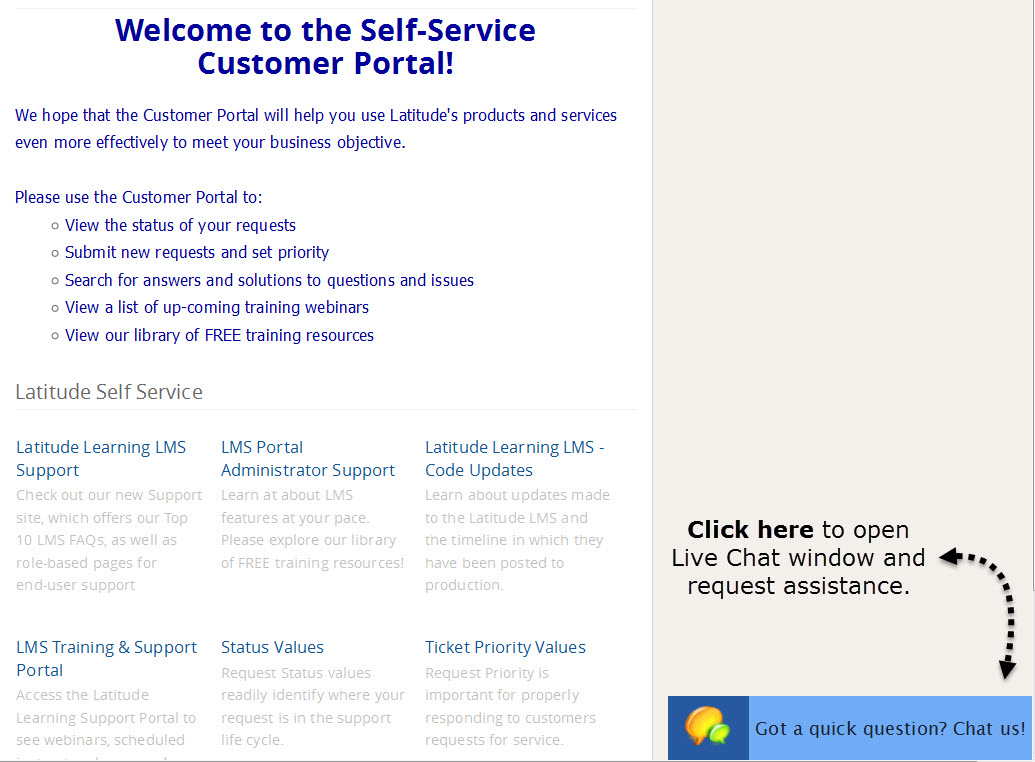 The Latitude Learning Support team has launched its new Live Chat feature. All administrators with access to the Customer Portal can log in and initiate a real-time chat session with a customer service representative. Live Chat allows for fast, friendly service during our normal support hours.